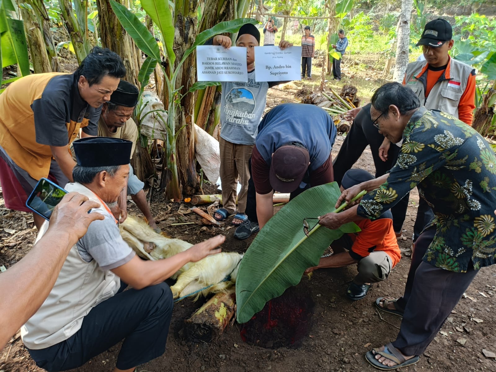 Sesampainya di Songbanyu, tim disambut hangat oleh warga. Bersama masyarakat setempat, para relawan melaksanakan pemotongan 6 ekor hewan kurban. Daging kurban didistribusikan langsung kepada warga sebagai wujud kepedulian dan semangat berbagi di momen Idul Adha.