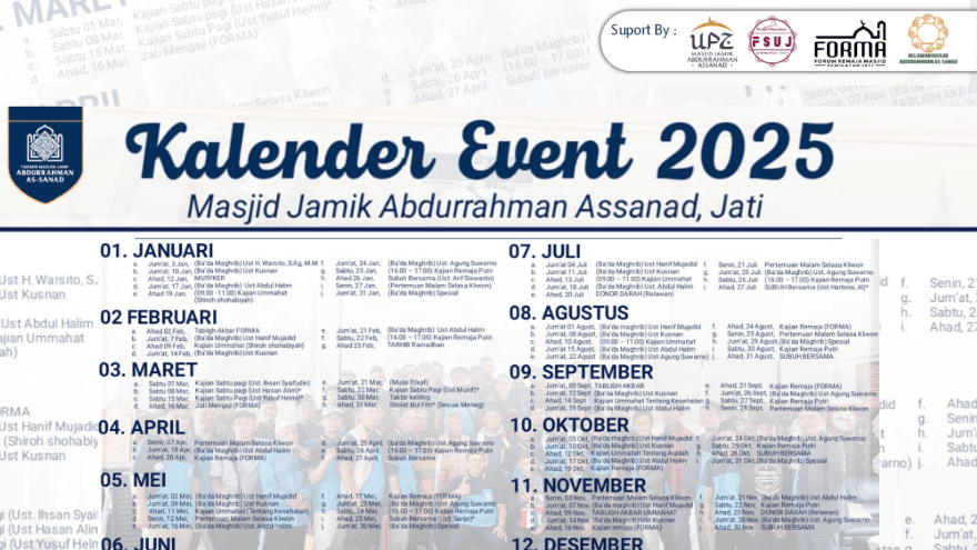 Sukoharjo (27/9/2025) – Dalam rangka memperingati Maulid Nabi Muhammad shallallāhu ‘alaihi wasallam, Takmir Masjid Jami’ Abdurrahman As-Sanad menyelenggarakan Tabligh Akbar… Tabligh Akbar: Sang Nabi Teladan Sejati Bersama Ust. Drs. H. Haris Fuady